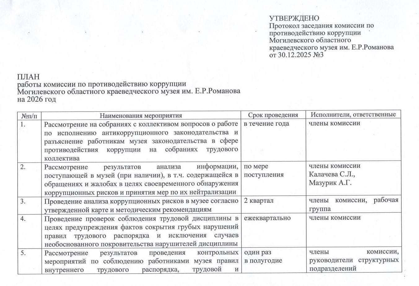 30 января 2026 года состоится заседание комиссии по противодействию коррупции в УК «Могилевский областной краеведческий музей им. Е.Р. Романова». Заседание пройдет по адресу: г. Могилев, пл. Славы, 1. Начало в 10.00